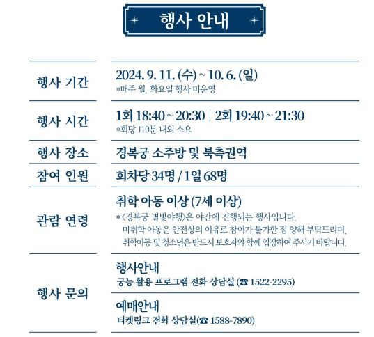 - 경복궁 별빛야행은 단순한 관람이 아닌, 한국 문화와 역사를 체험할 수 있는 좋은 기회입니다.