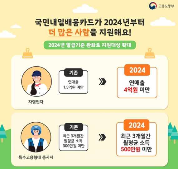2024년부터는 몇 가지 주요 변경 사항이 도입됩니다. 특히 자영업자와 특수고용형태 근로자에 대한 기준이 완화되었는데, 자영업자의 연소득 한도가 1,500만 원에서 4,000만 원으로 증가하였습니다. 특수고용형태 근로자의 경우, 최근 3개월 평균 월소득 한도가 300만 원에서 500만 원으로 상향 조정되었습니다. 이러한 변경 사항은 보다 많은 사람들이 국민내일배움카드를 신청할 수 있도록 하기 위한 것입니다.