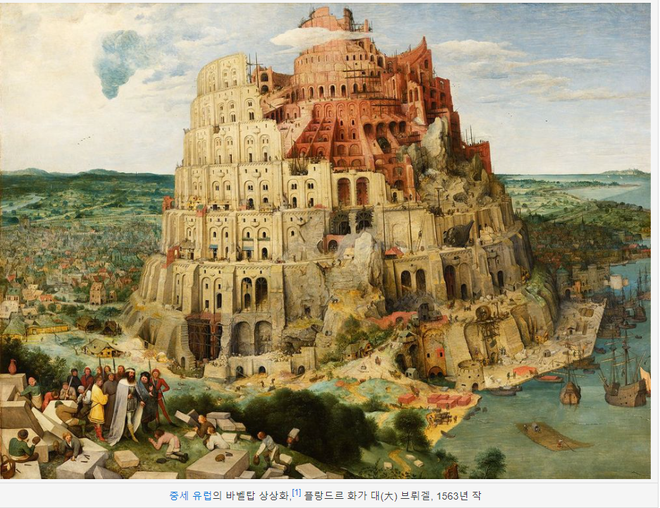 ‘바벨 탑’ 구약성서 창세기 제11장에 등장하는 건축물로서 인간들이 천국에 닿으려고 계속 쌓았는데 그 오만함에 분노한 야훼가 모든 인간의 말을 제각각으로 만들고 사람들을 온 땅으로 흩어 버리는 바람에 공사가 중단되어 버렸다고 합니다.