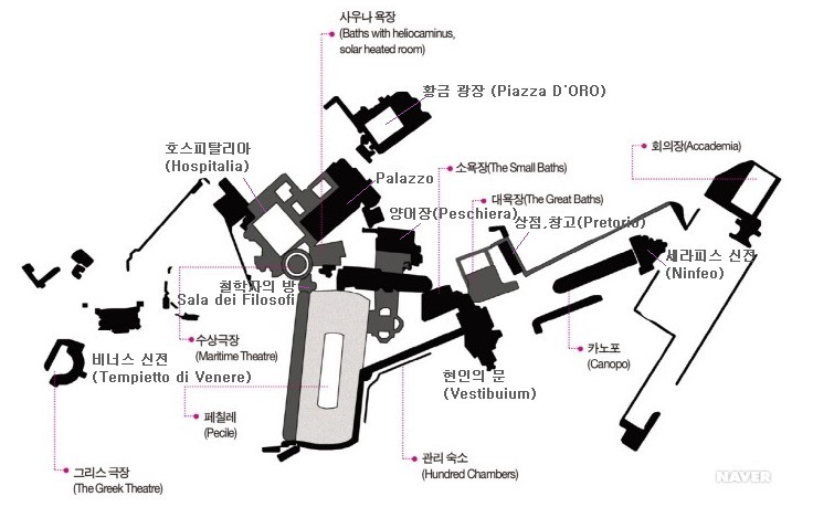 궁전 앞에는 도서관과 해상 극장, 태양열 난방 목욕탕, 도리스식 기둥이 있는 회랑, 소욕장, 대욕장, 프레토리움 등을 배치하였습니다.
