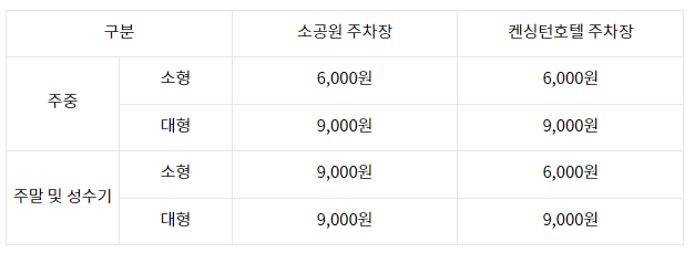 - 켄싱턴호텔 주차장은 주중과 주말, 성수기 요금이 동일합니다.