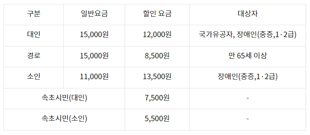 - 일반요금에서 국가 유공자 및 장애 중증 및 1·2급, 경로우대와 속초시민은 할인을 받으실 수 있습니다.