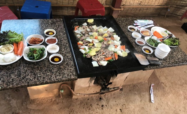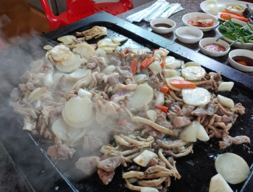 두꺼운 돌판에 오리를 구워 먹기 때문에 돌판이 달궈지는 시간이 있어서