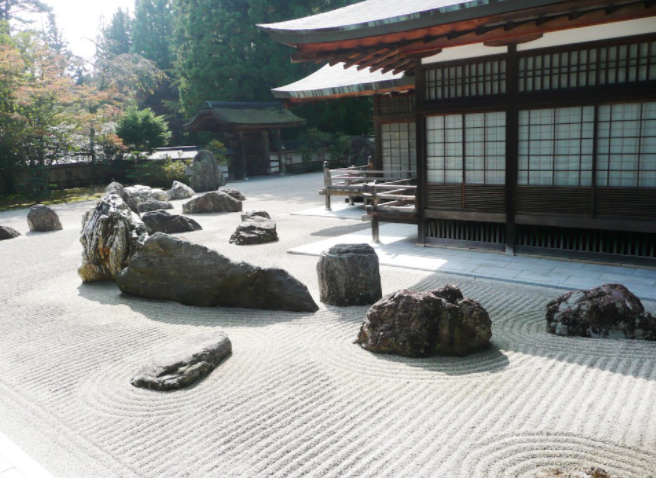 '센즈이 카와라모노(산, 도랑, 강바닥을 만드는 사람들)'라고 불리던 숙련된 장인 집단들은 '카레산스이(고산수, 枯山水-돌과 모래로만 산수를 표현한 정원)'라고 하는 새로운 양식의 정원을 만들었습니다. 선종의 영향을 많이 받은 이러한 정원들은 매우 추상적이어서 나무를 다듬어 산봉우리의 생김새를 얻게 하고 바위는 폭포로 상징하며 왕모래를 깔아 냇물이 흐르는 느낌을 표현하였습니다.