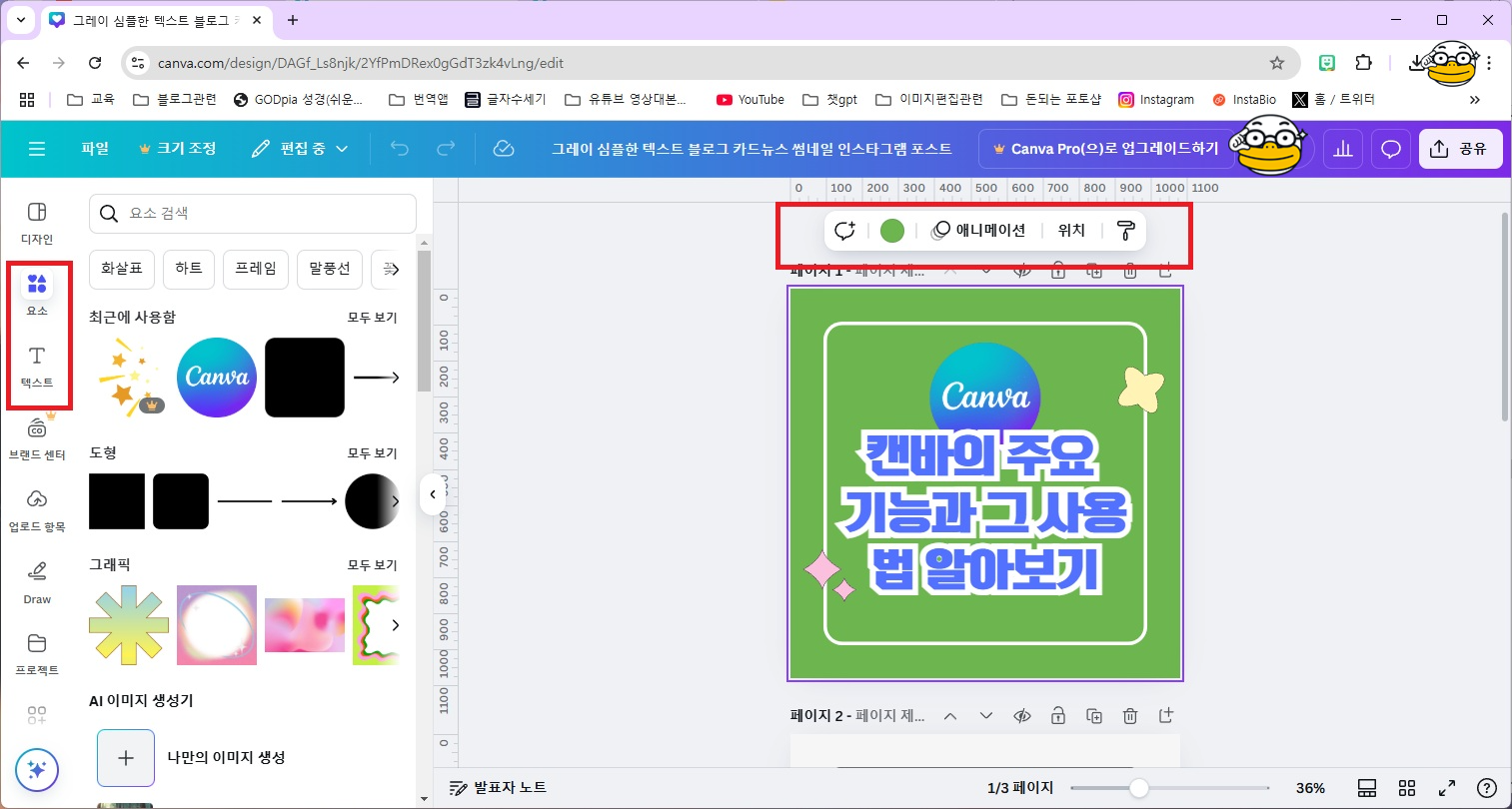 캔바의 장점은 누구나 쉽게 사용할 수 있고, 다양한 템플릿과 디자인 요소를 제공한다는 거예요. 또 협업 기능이 있어 팀 프로젝트에 딱이죠. 하지만 무료 버전에서는 기능이 제한적이고, 고급 기능을 쓰려면 유료로 구독해야 한다는 단점도 있어요.