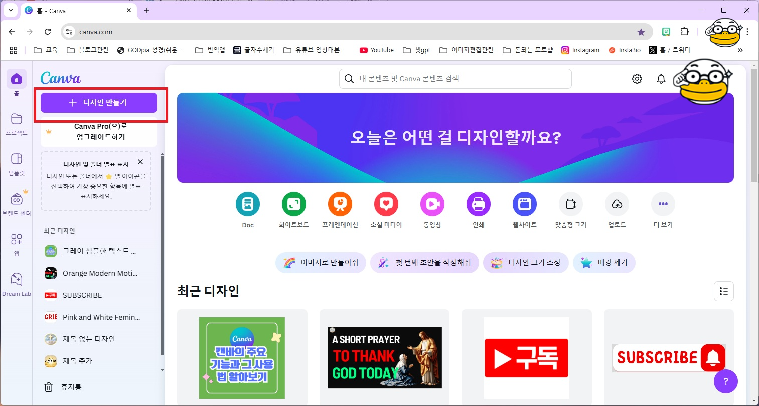 1. 디자인 만들기: 캔바 메인 화면에서 "디자인 만들기" 버튼을 클릭하세요.