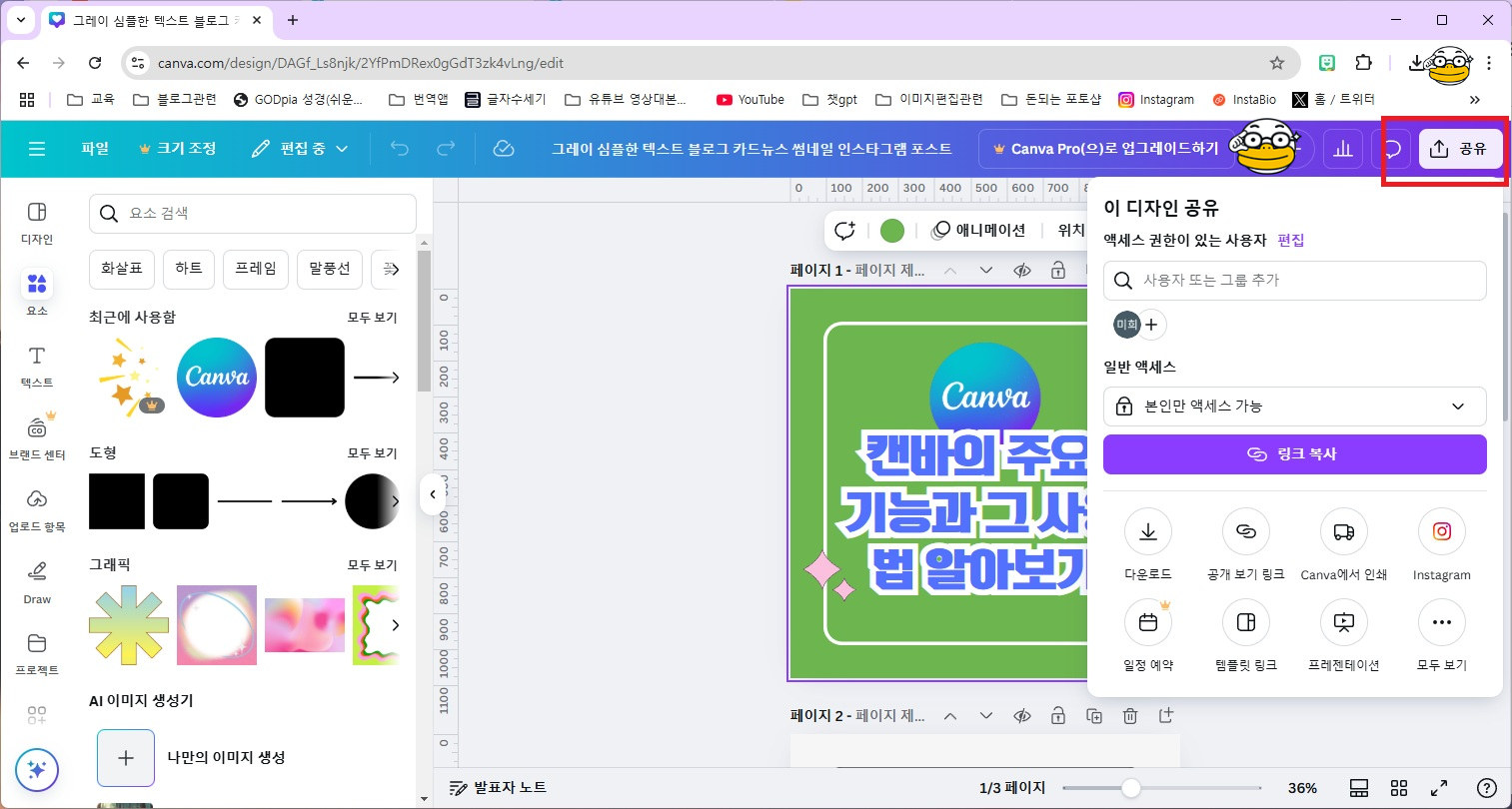 4. 저장 및 공유: 디자인이 끝났다면 상단 메뉴에서 저장하고 다른 사람과 공유하거나 다운로드할 수 있어요.