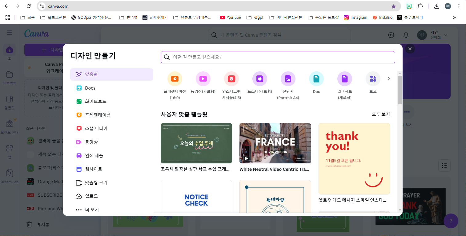 - 검색창에 ‘인스타그램 포스트’, ‘유튜브 썸네일’, ‘프레젠테이션’ 등 원하는 유형을 입력하세요.