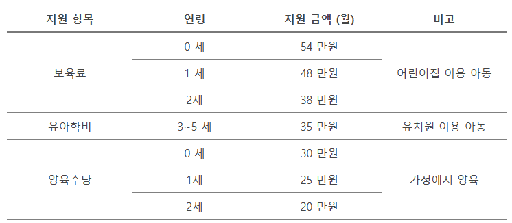 - 보육료, 유아학비, 양육수당 등 다양한 지원이 제공됩니다.